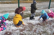 В МБДОУ "Шеланговский детский сад" дети во время прогулки вместе с воспитателем Татьяной Максимовой наблюдали за снегом. Дети трогали снег руками, держали на ладошках. С помощью наводящих вопросов воспитателя, дети сделали вывод: снег холодный ,белого цвета, тает на солнце, а воспитатель прочитала стихотворение "Первый снег".