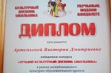 По итогам конкурса по печатному "Культурному дневнику школьника" в 2019-2020 учебном году в Республике Татарстан определено 216 победителей в номинации «Лучший культурный дневник школьника». Среди победителей ученица 3 «А» класса МБОУ "Верхнеуслонская гимназия" Артемьева Виктория (классный руководитель Куклихина Татьяна Сергеевна). Виктория награждена Дипломом Победителя и ценным памятным подарком. Поздравляем Викторию и ее педагога! Участвуйте и побеждайте!