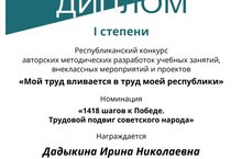 Республиканская конкурсная комиссия рассмотрела конкурсные материалы 139 участников на соответствие критериям, установленным в положении о конкурсе. Победители республиканского конкурса авторских методических разработок учебных занятий, внеклассных мероприятий и проектов «Мой труд вливается в труд моей республики» награждаются дипломами I, II и III степени, остальные участники – дипломами лауреатов или сертификатами участников конкурса.В номинации « 1418 шагов к Победе». Трудовой подвиг советского народа» свою работу представила руководитель РМО учителей истории и обществознания, учитель истории МБОУ «Татарско-Бурнашевская СОШ» Дадыкина И.Н.