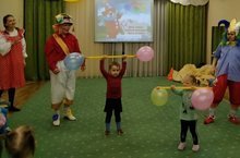 В Верхнеуслонском детском саду «Солнышко» в гости к детям пришли веселые клоуны Тимоша и Малыш (воспитатель Кольцова Р.В., музыкальный руководитель Кадырова Л.Ф.), которые вместе с ведущей праздника (воспитатель Платцева Ф.З.) встречали детей шутками и смехом.