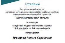 В рамках реализации задач Стратегии развития воспитания обучающихся в республике Татарстан на 2015-2025 годы и в связи с объявлением 2021 года в Республике Татарстан Годом родных языков и народного единства с 11 января по 15 марта 2021 года в республике проходил конкурс авторских методических разработок «Славим человека труда». Конкурс организован Институтом развития образования Республики Татарстан. В проекте приняла участие Рима Троицкая, педагог дополнительного образования МБУДО «Центр дополнительного образования». Сегодня подведены итоги конкурса. Методическая разработка музейного урока Римы Сергеевны «Всё для фронта, всё для победы» заняла 1 место.