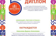 От Введенско-Слободского детского сада в номинации «Конкурс рисунков и плакатов по теме «Как современная энергетика и новые виды энергии изменили жизнь человека?» участие принимала Дарина Алексеева, руководитель – воспитатель Альбина Игнатьева. Работа нашей воспитанницы получила хорошую оценку жюри и была награждена дипломом участника. Воспитатель награждена благодарственным письмом от оргкомитета за высокий уровень педагогического мастерства, проявленный при подготовке проекта.