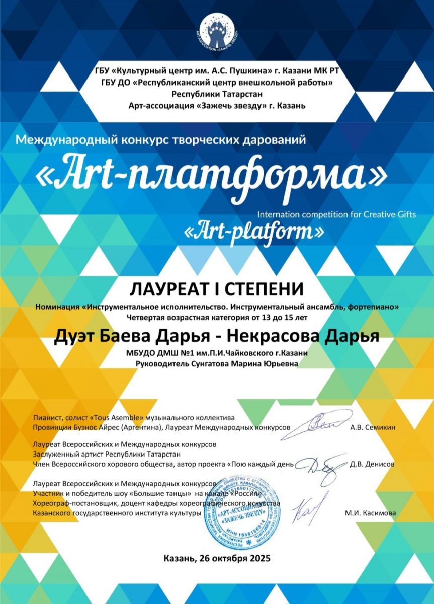 Международный конкурс творческих дарований "Art-платформа" - Баева Дарья- Некрасова Дарья, Лауреаты I степени, класс Сунгатовой М.Ю.;