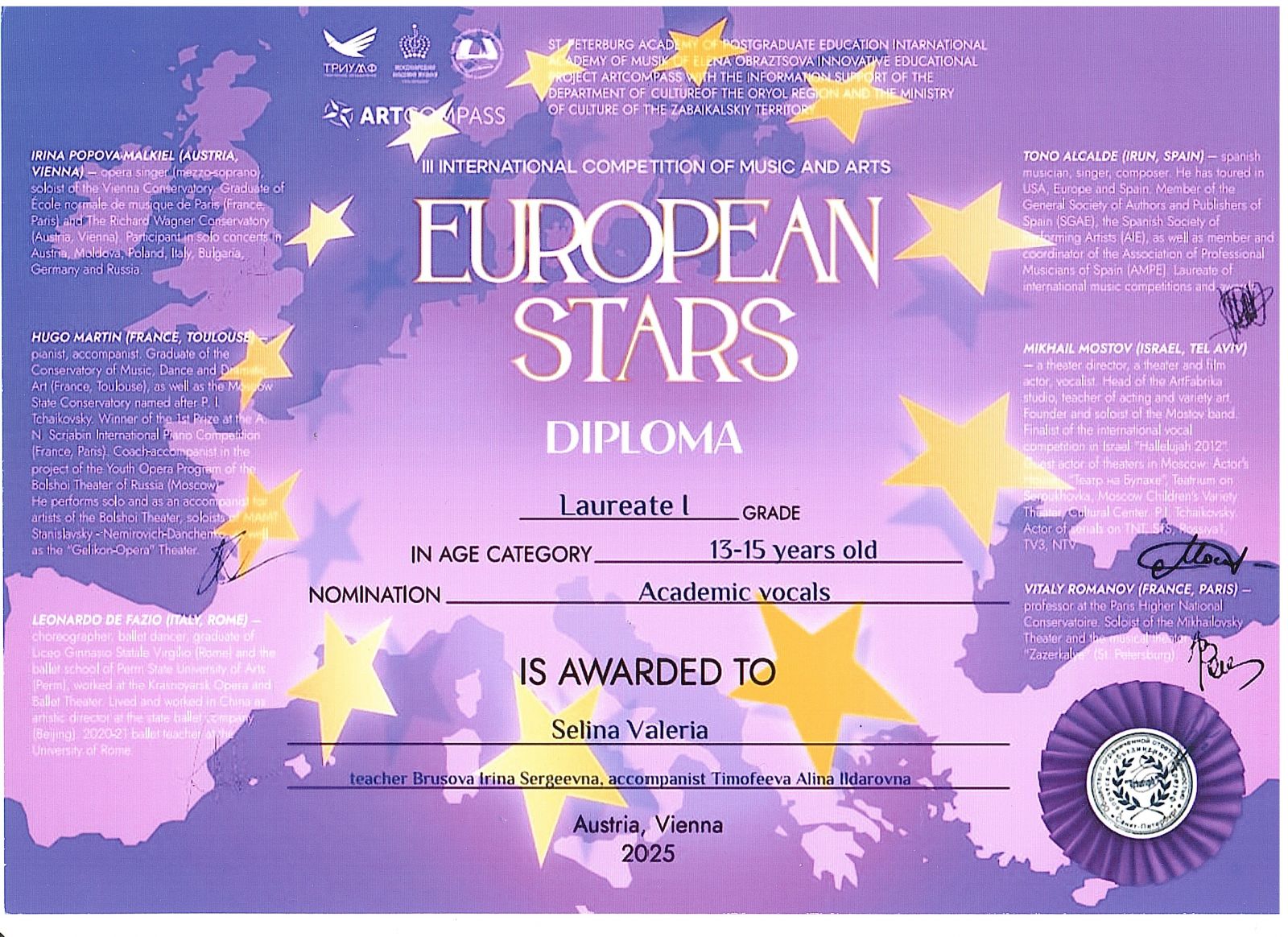III Международный конкурс музыки и искусства "European Stars" - Селина Валерия, Лауреат I степени, рук. Брусова И.С., концертмейстер Казакова А.И.;