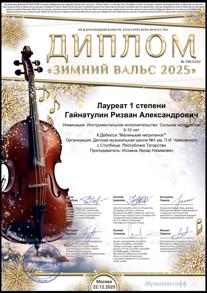 Международный конкурс классического искусства "Зимний вальс 2025" - Гайнатулин Ризван, Лауреат III степени, за исполнение пьесы "Маленький нигритёнок", класс Исхакова Л.Н.;