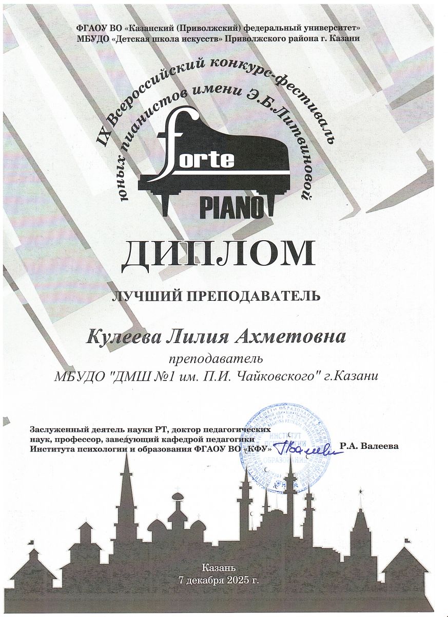 Межрегиональный конкурс музыкального искусства "Forte"- Лучший преподаватель Сунгатова М.Ю.;