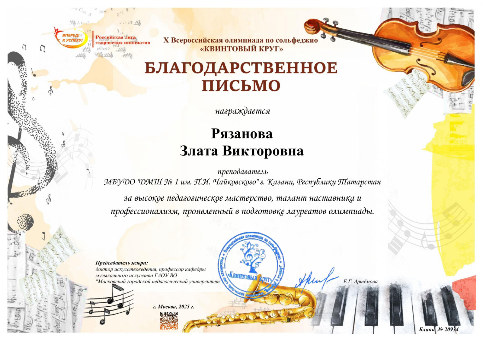 Международная олимпиада по сольфеджио "Золотой камертон - 2025" - Благодарность Рязвновой З.В.;