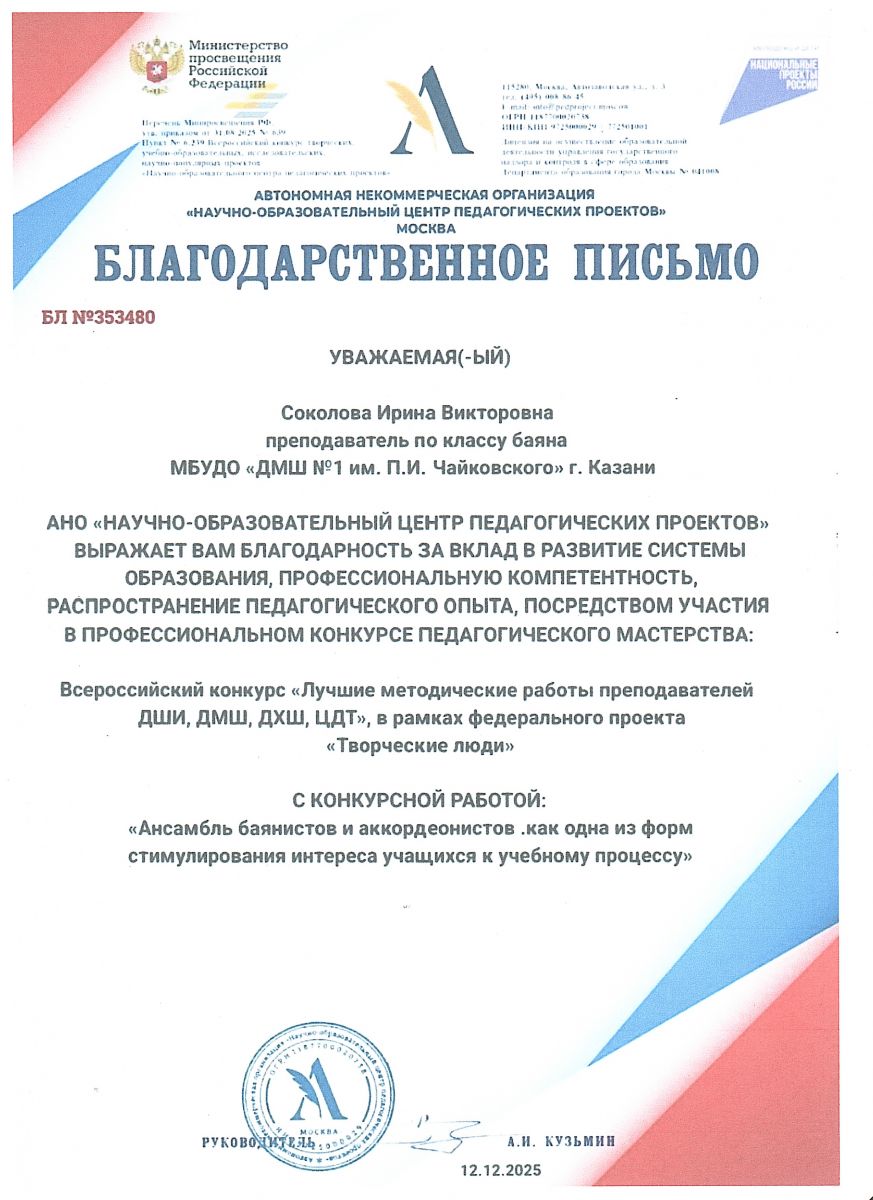 АНО "Научно-образовательный центр педагогических проектов" - Благодарность Соколовой И.В.;