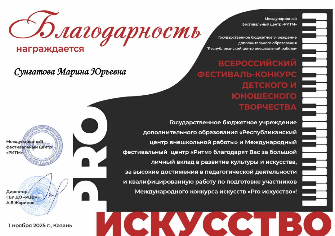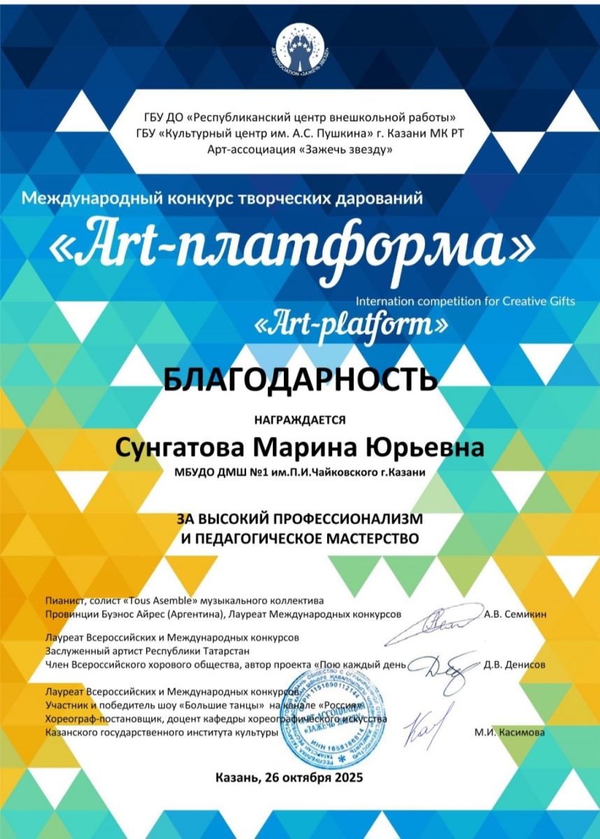 Международный конкурс творческих дарований "Art-платформа" - Благодарность Сунгатовой М.Ю.;