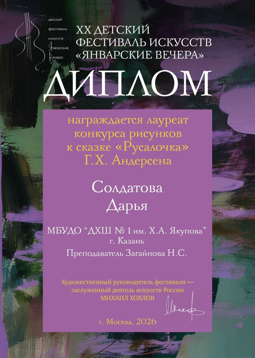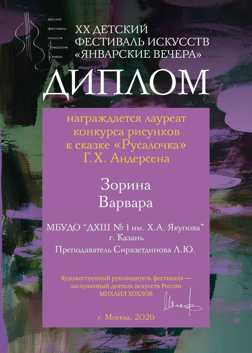 От всей души поздравляем учащихся нашей школы, ставших лауреатами XX ДЕТСКОГО ФЕСТИВАЛЯ ИСКУССТВ "ЯНВАРСКИЕ ВЕЧЕРА" и преподавателей Сиразетдинову Л.Ю, Максимову О. А., Загайнову Н.С. и Максутову А.Е. с высокими творческими достижениями.