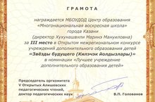ЦЕНТР ОБРАЗОВАНИЯ "МНОГОНАЦИОНАЛЬНАЯ ВОСКРЕСНАЯ ШКОЛА" Г.КАЗАНИ ЗАНЯЛА III МЕСТО В ОТКРЫТОМ МЕЖРЕГИОНАЛЬНОМ КОНКУРСЕ УЧРЕЖДЕНИЙ ДОПОЛНИТЕЛЬНОГО ОБРАЗОВАНИЯ ДЕТЕЙ "ЗВЕЗДЫ БУДУЩЕГО" В НОМИНАЦИИ "ЛУЧШЕЕ УЧРЕЖДЕНИЕ ДОПОЛНИТЕЛЬНОГО ОБРАЗОВАНИЯ ДЕТЕЙ". ПОЗДРАВЛЯЕМ ВСЕХ С ПОБЕДОЙ!