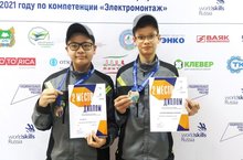 В отборочных соревнованиях участвовали и наши юниоры из 42 гимназии - Харьков Александр Сергеевич и Ле Туан Ту в компетенции «Электромонтаж», возраст Юниоры (12-14). Они заняли почетное 2 место и были награждены серебряными медалями.