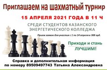 Впервые после долгого перерыва на территории Казанского энергетического колледжа прошел Турнир по шахматам, целью которого являлись популяризация шахмат среди студентов колледжа как одного из интеллектуальных видов спорта и выявление сильнейших игроков для участия в городских и/или республиканских соревнованиях по шахматам.