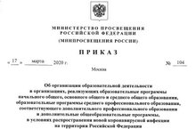 Приказ № 104 от 17 марта 2020 г. «Об организации образовательной деятельности в организациях, реализующих образовательные программы начального общего, основного общего и среднего общего образования, образовательные программы среднего профессионального образования, соответствующего дополнительного профессионального образования и дополнительные общеобразовательные программы, в условиях распространения новой коронавирусной инфекции на территории Российской Федерации».