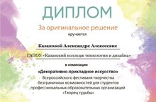 В конце ноября были подведены итоги Всероссийского фестиваля творчества безграничных возможностей для студентов ПОО «Творец судьбы».Студентка нашего колледжа, Казакова Александра, гр.29.02.05-4, представляла свои творческие изделия из бисера и стала обладателем диплома «За оригинальное решение» в номинации «Декоративно-прикладное искусство».Поздравляем!