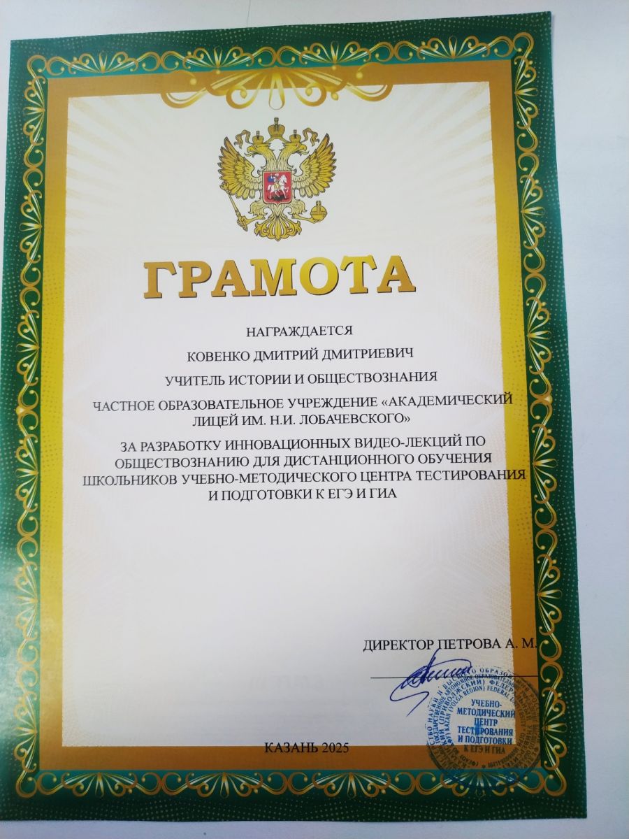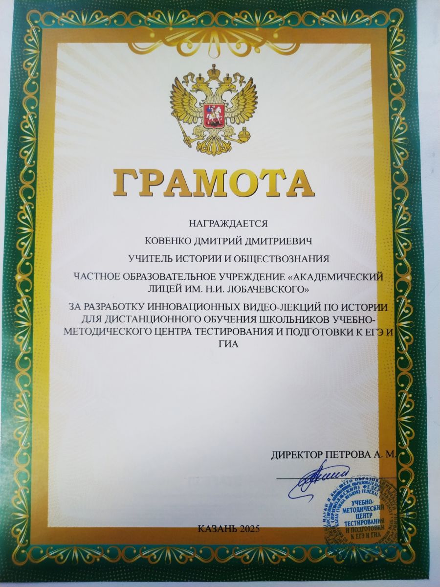 Опубликовано: 25.11.2025Поздравляем учителя истории и обществознания нашего лицея Дмитрия Дмитриевича Ковенко, получившего грамоты Учебно-методического центра Казанского федерального университета за разработку инновационных видео-лекций по истории и обществознанию для дистанционного обучения школьников!