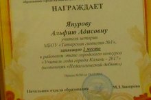 Гимназиябезнең тарих укытучысы Янурова Әлфия Әдис кызын «Ел укытучысы – 2017» шәһәр бәйгесенең район этабында «Педагогик дебют» номинациясендә II урын яулавы белән кайнар котлыйбыз! Мактауга лаек хезмәтендә тагын да зуррак уңышларга ирешүен, тир түккән хезмәтенең татлы җимешләргә һәрдаим бай булуын теләп калабыз.