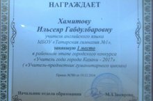 «Ел укытучысы – 2017» шәһәр бәйгесенең район этабында «Гуманитар фәннәр укытучысы» номинациясендә I урын яулаган Хәмитова Илсөяр Габделбәр кызын зур җиңүе белән котлыйбыз! Үз һөнәре җанына һәрвакыт рәхәтлек алып килсен, тырыш хезмәте һәрдаим хөрмәткә лаек булсын!