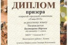 Рус теле фәненнән үткәрелгән “Умка – 2015” шәһәркүләм олимпиадасында 2 б сыйныфы укучысы Бахтиярова Нәргизә призер булды. Нәргизәне һәм аның укытучысы Шәфигуллина Эльвира Илгисовнаны уңышлары белән котлыйбыз.