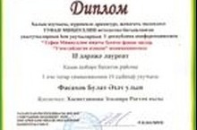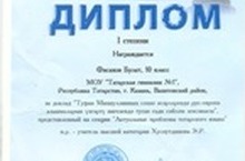10 А сыйныф укучысы Фасахов Булат “Туфан Миңнуллинның сәхнә әсәрләрендә рус-европа алынмаларын үзгәртү нигезендә туган гади сөйләм лексикасы” исемле фәнни хезмәте өчен I дәрәҗәдәге диплом белән бүләкләнде. 8 А сыйныфы укучысы Йосыпова Гүзәл, “1552 нче елдан соң татар халкынынң язмышы. Яулап алуның нәтиҗәләре” темасына фәнни эш яклап, “Уңышлы чыгышы өчен” дипломына лаек булды. Укучыларны зур җиңүләре белән котлыйбыз. Иҗади уңышлар телибез! -