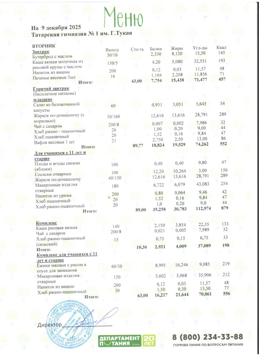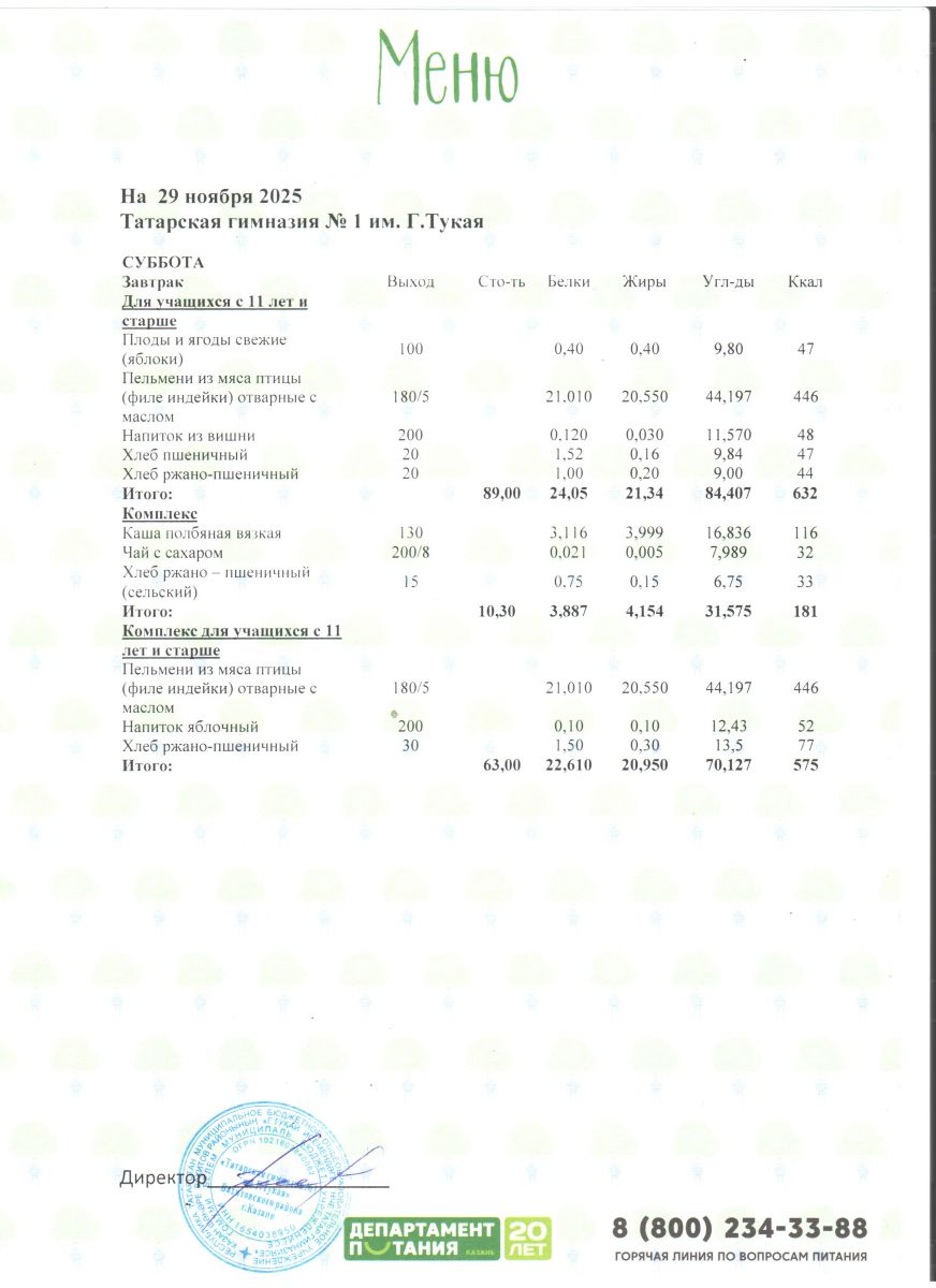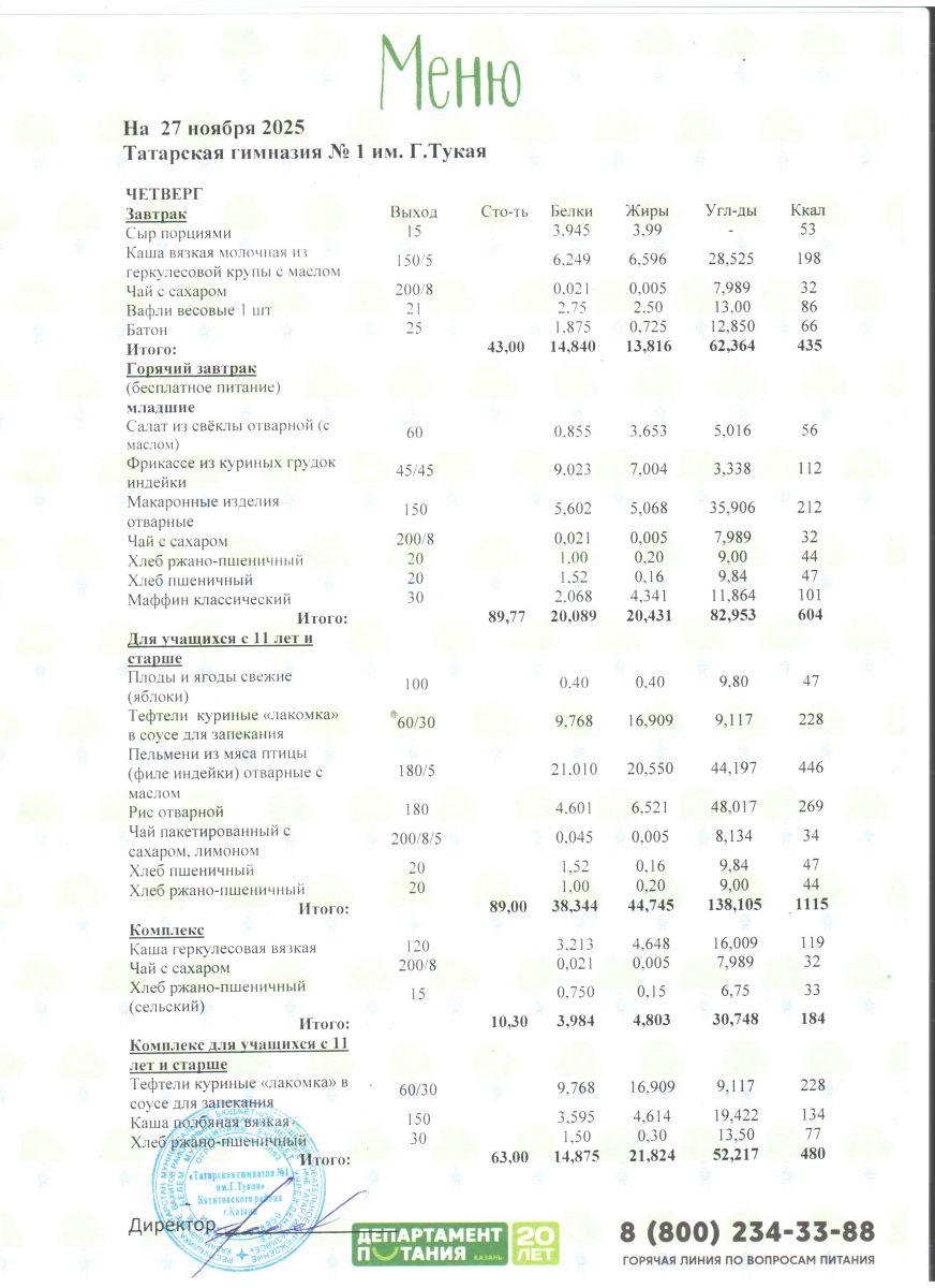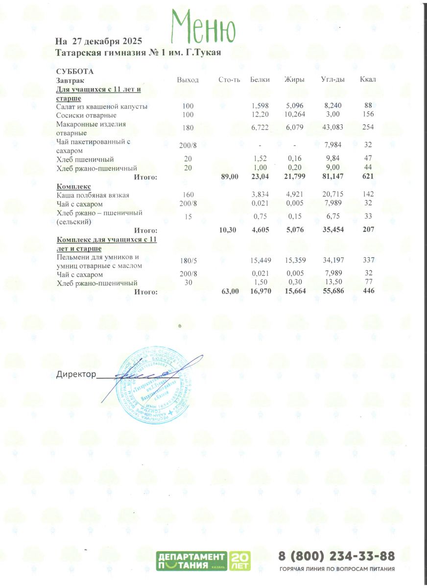 Услуги по организации питания в общеобразовательном учреждении МБОУ "Татарская имназия №1 им. Г. Тукая" г. Казани предоставляет АО "Департамент продовольствия и социального питания г. Казани" на основании договора, заключенного между образовательным учреждением и Депортаментом. АО «Департамент продовольствия и социального питания г.Казани»