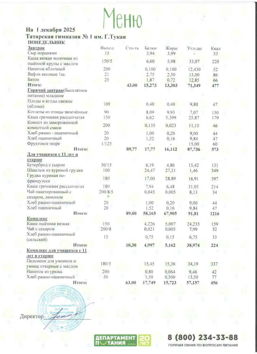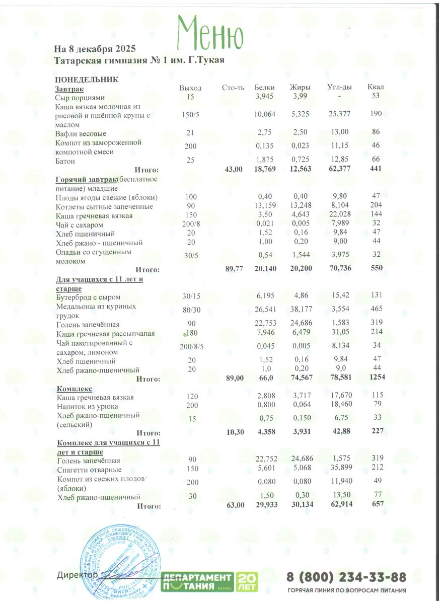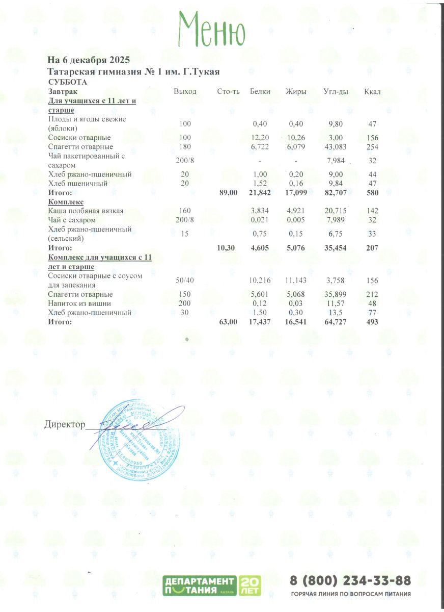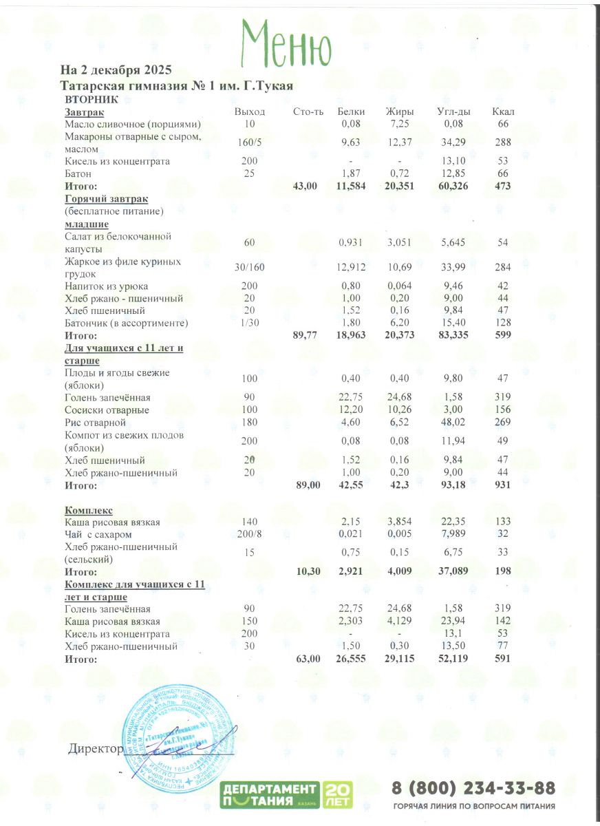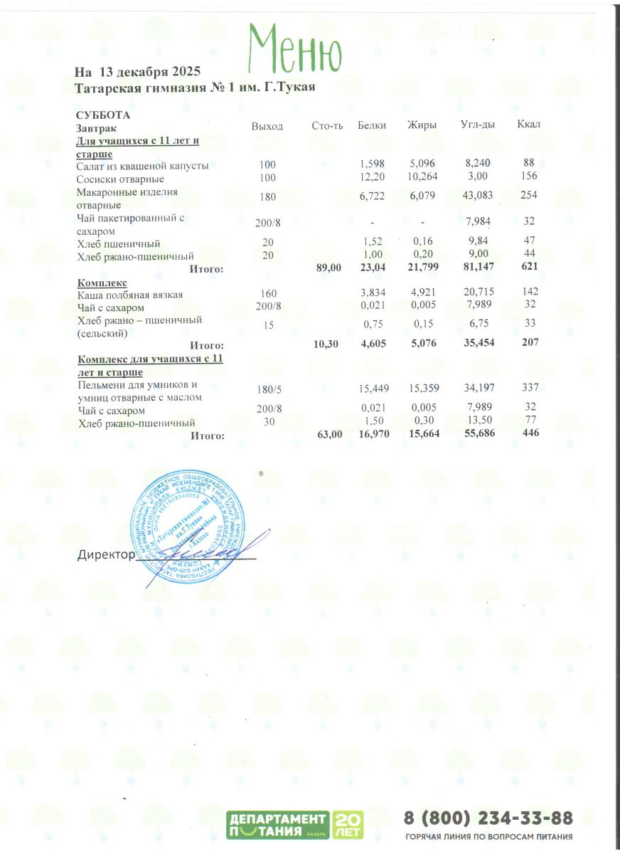 Услуги по организации питания в общеобразовательном учреждении МБОУ "Татарская имназия №1 им. Г. Тукая" г. Казани предоставляет АО "Департамент продовольствия и социального питания г. Казани" на основании договора, заключенного между образовательным учреждением и Депортаментом. АО «Департамент продовольствия и социального питания г.Казани»