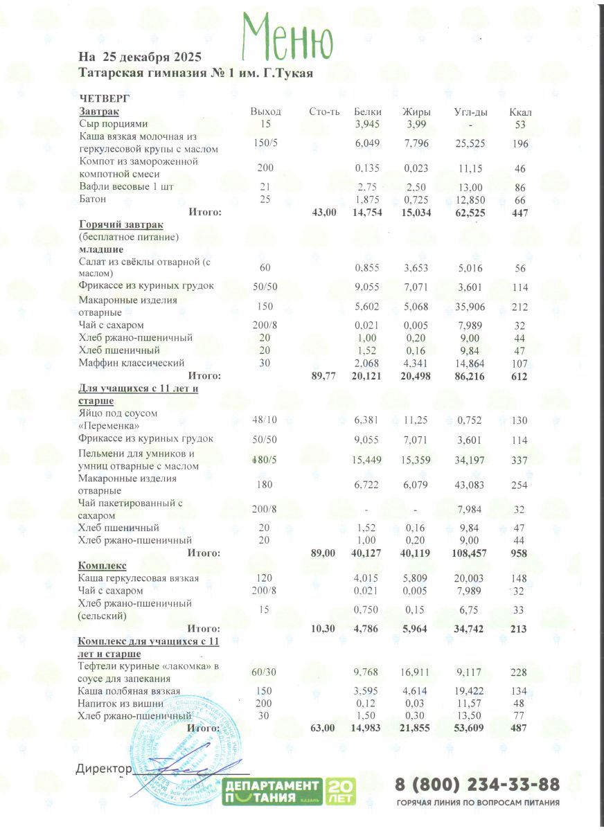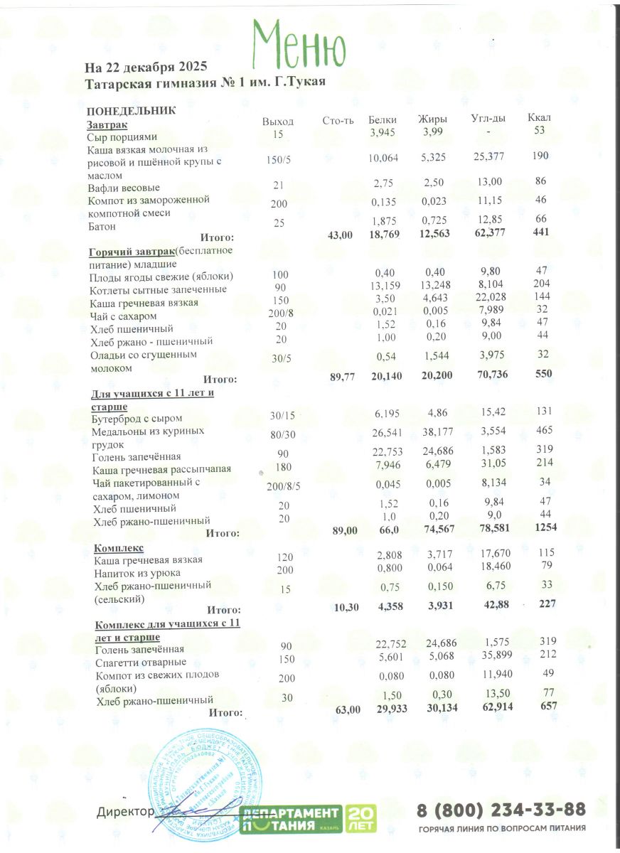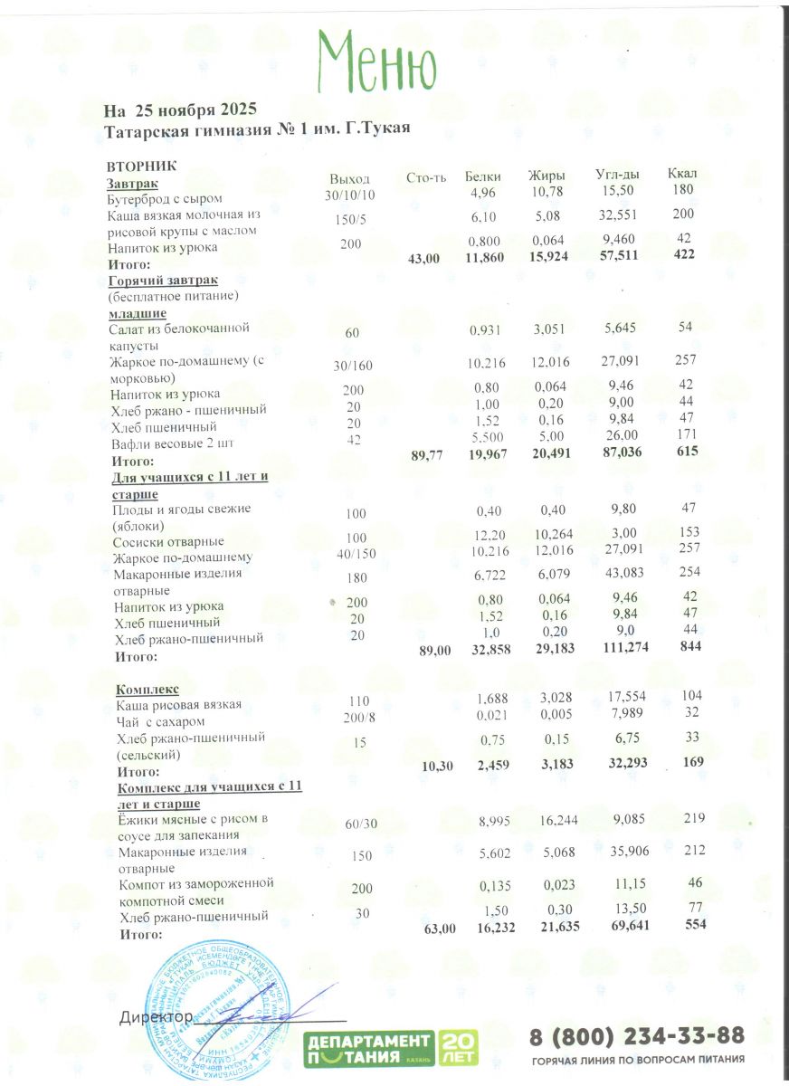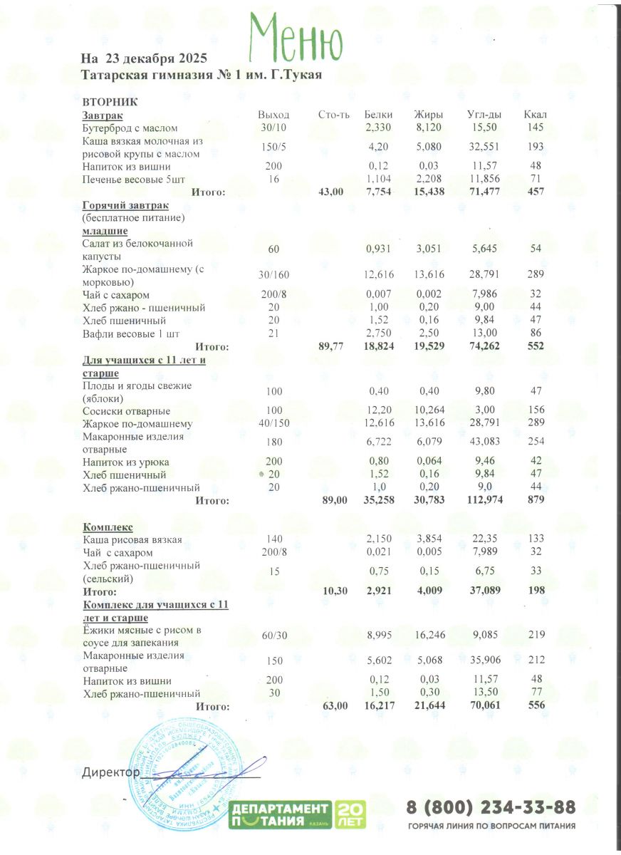 Услуги по организации питания в общеобразовательном учреждении МБОУ "Татарская имназия №1 им. Г. Тукая" г. Казани предоставляет АО "Департамент продовольствия и социального питания г. Казани" на основании договора, заключенного между образовательным учреждением и Депортаментом. АО «Департамент продовольствия и социального питания г.Казани»