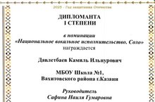 Ученик 5А класса Давлетбаев Камиль стал дипломантом I степени в номинации «Национальное вокальное исполнительство. Соло».