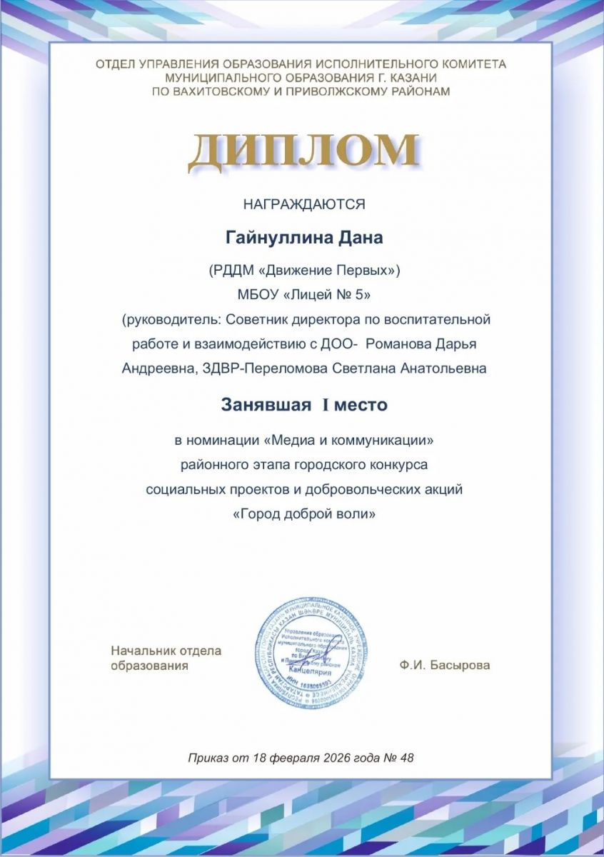 В номинации «Медиа и коммуникации» Дана заняла 1 место! Её проект — яркий пример того, как современные медиа могут служить добрым делам. Отдельная благодарность руководителю - советнику директора по воспитанию и взаимодействию с детскими общественными объединениями Романовой Д.А. за поддержку, наставничество и веру в успех!