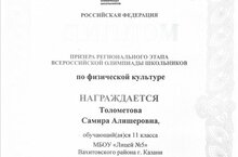Поздравляем ученицу 11 класса - Толометову Самиру, ставшую призером регионального этапа Всероссийской олимпиады школьников по физической культуре