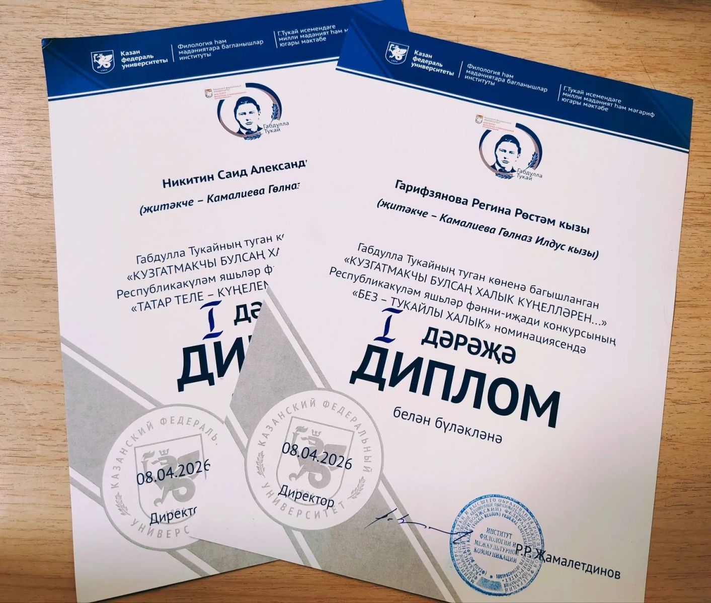 Поздравляем учащихся 3в класса - Гарифзянову Регину и Никитина Саида, занявших 1-е место в республиканском научно-творческом конкурсе «Кузгатмакчы булсаң халык күңелләрен... », посвященном дню рождения Габдуллы Тукая. Мы гордимся нашими звездочками и желаем им дальнейших успехов