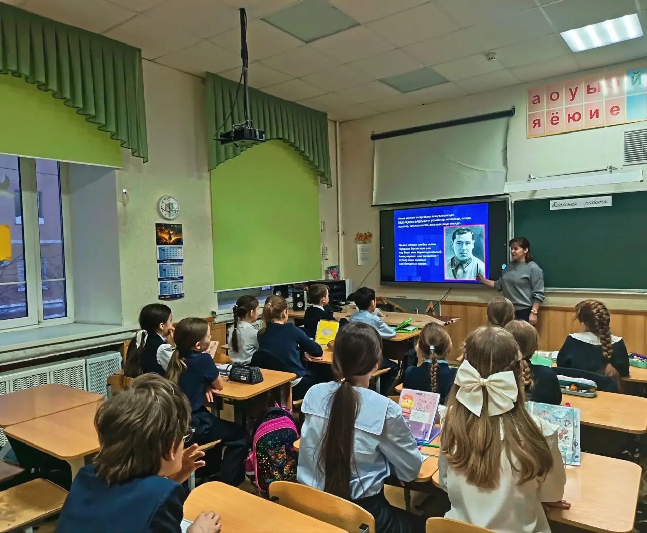 На уроке родного языка прошла литературная встреча, тема которой была приурочена ко дню рождения великого татарского поэта Мусы Джалиля. Светлана Тимуровна, заведующая библиотеки-филиала 41, поведала о героических поступках нашего соотечественника и поэта, поделилась историями о его великих подвигах, которые он совершил защищая свою родину и своих товарищей.