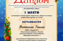 Ученица 5А класса Фаттахова Эмилия приняла участие в Республиканском конкурсе творческих работ среди воспитанников, учащихся и педагогических работников образовательных организаций «ВОЛШЕБНИЦА ЗИМА».