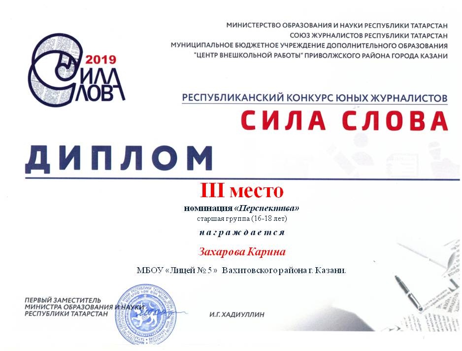 Ученицы нашего лицея - Захарова Карина (11А) и Захарова Лия (7А) - приняли участие в республиканском конкурсе юных журналистов «Сила слова». Данный конкурс направлен на создание условий для выявления и развития детей с повышенным уровнем способностей в области журналистики, пропаганды исторических и культурных ценностей народов, сегодняшнего дня Республики Татарстан.