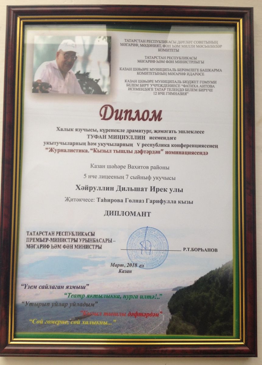 В конференции принял ученик 7Б класса Хайруллин Дильшат Ирекович в номинации "Журналистика.Кызыл тышлы дәфтәрдән". За успешное выступление он был награжден дипломом. Желаем Дильшату дальнейших побед и удачи! -