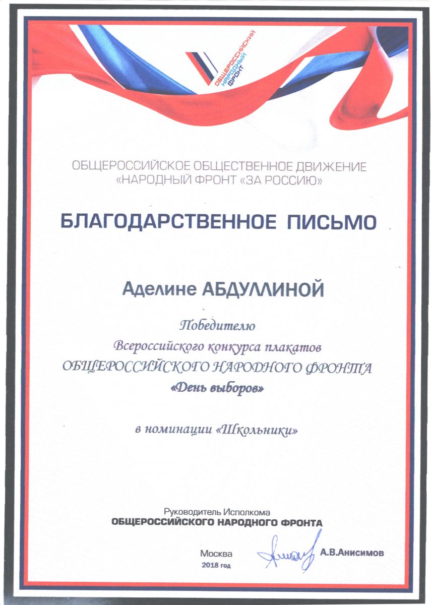 От всей души поздравляем ученицу 10»б» класса АБДУЛЛИНУ АДЕЛИНУ с ПОБЕДОЙ на Всероссийском конкурсе плакатов Общероссийского Народного Фронта «День выборов» в номинации «Школьники»!!!Торжественное вручение награды победителю состоялось в Москве. Желаем новых творческих побед, новых конкурсов и покорения новых высот!!!