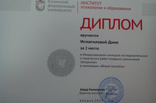Поздравляем Исмагилову Дину, ученицу 6 класса, с победой в Международном конкурсе исследовательских и творческих работ младших школьников «Открытие» в номинации «Юный писатель». Дина награждена Дипломом 2 степени (учитель Федотова С.М.).Желаем нашей ученице удачи дальнейших побед!!!
