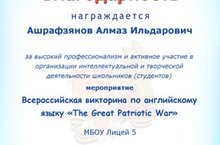 Поздравляем учеников 8 а класса, занявших призовые места во Всероссийской викторине по английскому языку «The Grait Patriotic War» (учитель – Ашрафзянов Алмаз Ильдарович): Бакееву Зилю Булатовну – 2 место Бутбайя Анну Демуровну – 3 место. Желаем творческих успехов!