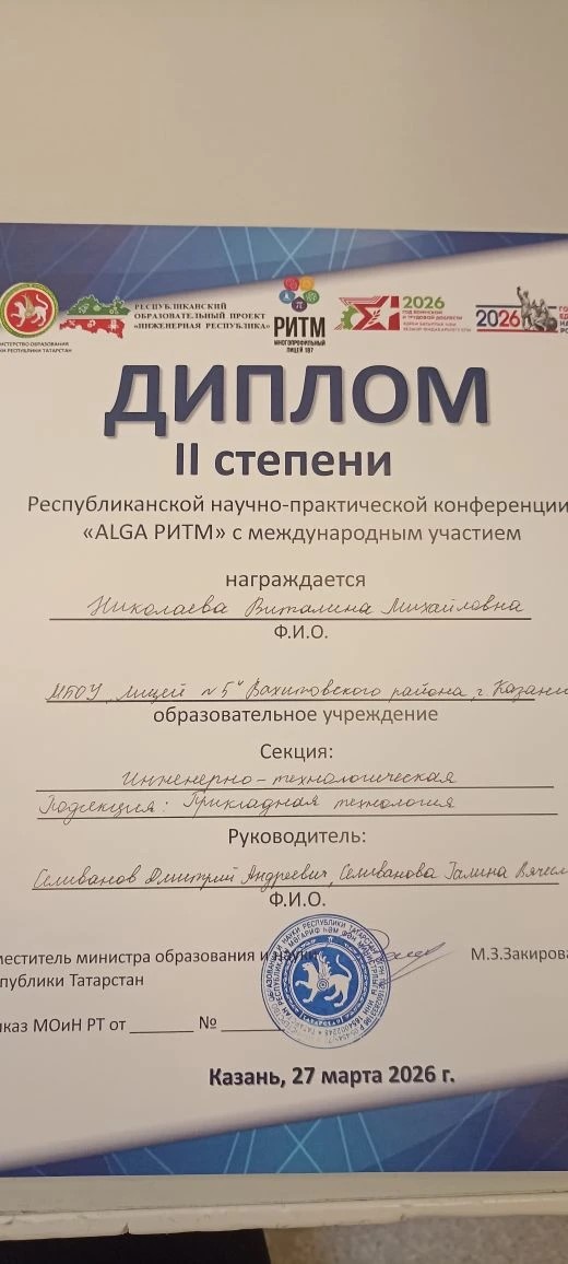 27 марта 2026 года на базе «Многопрофильного лицея №187» состоялась Республиканская научно-практическая конференция «ALGA РИТМ» с международным участием. На конференции были представлен 620 работ по разным направлениям науки и техники. Ученицы 11В класса Трифонова Алисия, Трифонова Ариана и ученица 10а класса Николаева Виталина достойно защитили свои проекты в Инженерно-технологической секции. Трифонова Алисия (диплом 1 степени), Николаева Виталина (диплом 2 степени). Научные руководители педагог доп. образования Селиванов Д.А., учитель физики Селиванова Г.В.