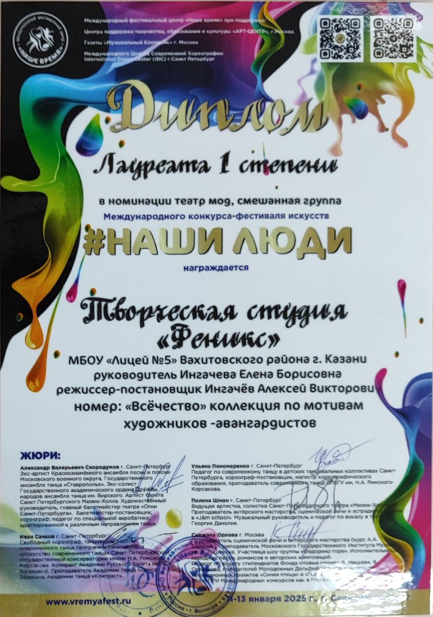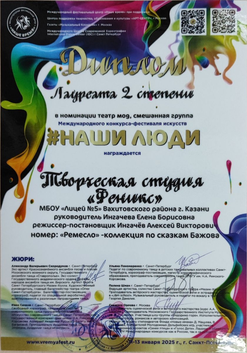11-12 января в городе Санкт-Петербург проходил Международный конкурс-фестиваль "Наши люди". Творческая студия " Феникс" участвовала в номинации "Театр мод" и представила на суд жюри две коллекции : "Всëчество" - костюмы по мотивам художников-авангардистов и "Ремесло"- по мотивам сказок П, Бажова. Достойно выступив на фестивале ребята из Творческой студии стали Лауреатами 1 и 2 степени! Поздравляем и желаем дальнейших побед!