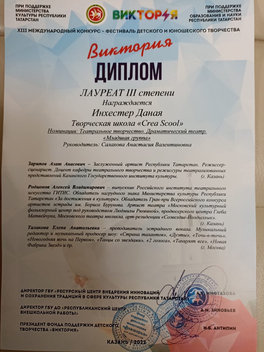 Поздравляем Инхестер Данаю,лауреата lll степени Xlll Международного конкурса- фестиваля детского и юношеского творчества в номинации 'Театральное творчество.Драматический театр.' 'Младшая группа'.