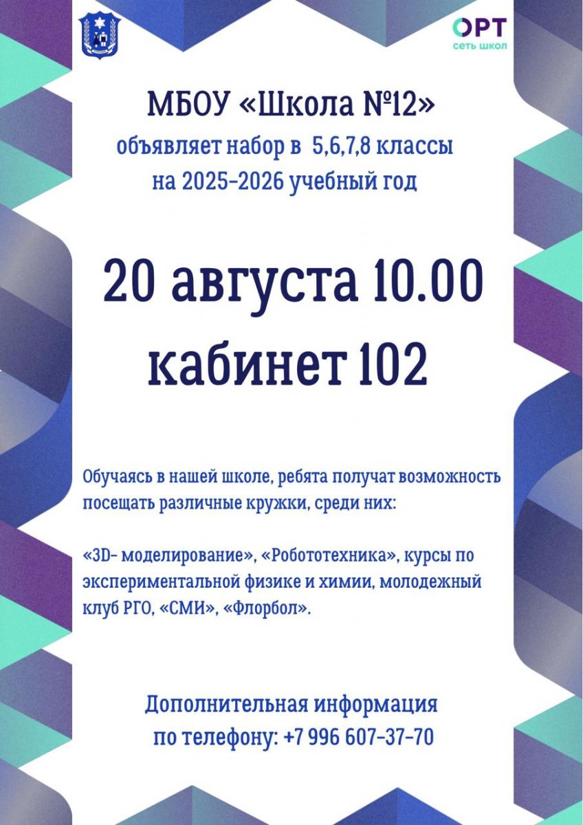 МБОУ «Школа №12» объявляет набор обучающихся в 5,6,7,8 классы. Ждем ВАС 28 мая 2025г в 10.00 в 102 кабинете.