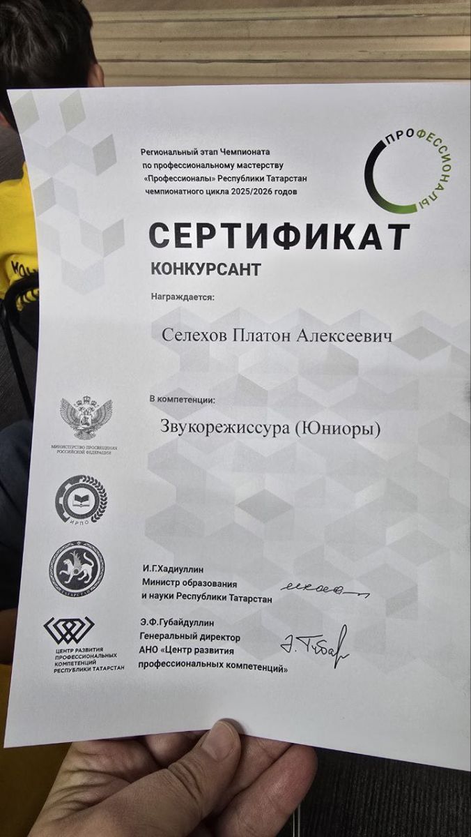 В 2025 году в Татарстане активно участвовали в чемпионате профессионального мастерства «Профессионалы», где представители региона продемонстрировали высокий уровень подготовки и профессионализма. Участник из Школы №12 г. Казань, Селехов Платон, успешно прошёл отбор и принял участие в чемпионате по направлению «Звукорежиссура», заняв 6 место по Республике Татарстан. Этот результат стал достойным достижением, подтверждающим высокий уровень профессиональной подготовки и творческий потенциал молодёжи региона.
