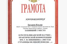 Поздравляем с победой ученика 10 класса Багырова И.( руководитель проекта Гильмиева Г.Г.) в республиканской конференции имени Никишина «Листая страницы великой победы» в секции «Растим патриотов».Гордимся нашим учеником и желаем ему побед и в дальнейшем.