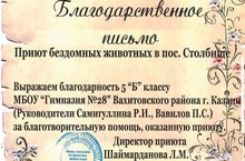 В течение года учащиеся гимназии оказывали помощь приюту бездомных животных в поселке Столбище. В рамках весенней недели добра ребята были награждены благодарственным письмом.