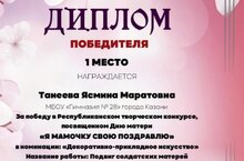 Наши Достижения: мы приняли участие в Республиканском творческом конкурсе, посвященном Дню матери "Я мамочку свою поздравлю". Ясмина Танеева - победитель в номинации "Декоративно-прикладное искусство" (работа "Подвиг солдатских матерей", руководитель Самигуллина Р.И.).иПолина Агафонова - победитель в номинации "Декоративно-прикладное искусство" (работа "Подарок маме - волшебная книга", руководитель Самигуллина Р.И.) Творческий коллектив "Радуга" - победитель в номинации "Музыкальное творчество" (танец "Колыбельная", руководитель Садриева Ю.А.)
