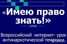 С 1 октября в школе стартовал Всероссийский проект - Интернет-урок «Имею право знать!» Данный проект направлен на профилактику наркомании среди детей и подростков. Учащиеся 6-11 классов на уроках информатики, а также на классных часах вместе с педагогами выходят на сайт УФСКН, знакомятся, согласно своему возрасту, с информацией, направленной на профилактику употребления ПАВ и пропаганду ЗОЖ.