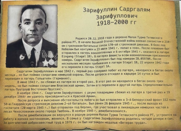 Зарифуллин Садргалям Зарифуллович родился 20 декабря 1918 года в деревне Малая Турма Тетюшского района Республики Татарстан. В начале Великой Отечественной войны воевал связистом в 210-ом стрелковом батальоне связи 170-ой стрелковой дивизии. В боях под Нобелем был контужен и 23 июля 1941 года попал в плен и 6 октября был отправлен в лагерь военнопленных. Фашисты всем военнопленным присваивали номера. Садргалям Зарифуллович был под номером IB. 05970R. После нескольких месяцев пребывания в лагере Stagal 1B, 22 апреля 1942 года его перевели в лагерь Stagal 1A. В мае 1942 года он первый раз совершил побег из лагеря, находился в бегах около месяца, но был пойман солдатами немецкой охраны. После допроса отсидел в карцере 14 суток и был переведен в лагерь Гольштейн (Германия).
