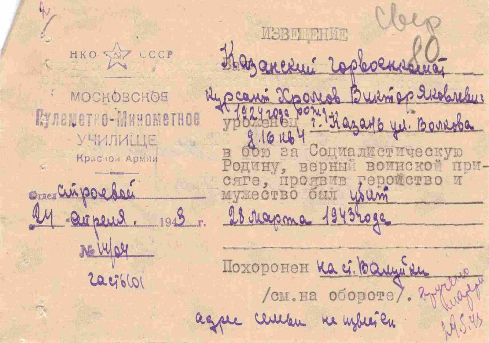 Никогда не знала я своего деда, Храмова Якова Федоровича, старшего сержанта, дошедшего до Берлина. Ему было уже 52 – непризывной возраст, - когда он добровольцем ушёл на фронт вместе с сыном Виктором. Только встретиться им больше не удалось: рядовой Храмов Виктор Яковлевич, курсант Московского пулемётно-миномётного училища Красной Армии, не успев получить первое офицерское звание младший лейтенант, погиб, девятнадцатилетний, при артобстреле под станцией Валуйки Белгородской области, когда их эшелон направлялся на фронт. От Виктора в нашем альбоме не осталось даже фотографии – только строчка в донесении о безвозвратных потерях из архива.