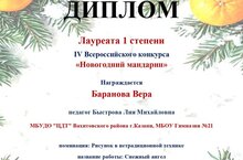 Целая команда победителей среди тех, кто не стоит на месте, а покоряет все новые вершины мастерства! Поздравляем с победой в IV Всероссийском конкурсе "Новогодний мандарин": учащихся студии "Волшебная кисточка" (педагог Фоменко А.Р.): Валишину Лиану, Мозаффарову Айсылу, Тукову Весну, Шухта Ксению; учащихся студии "Созвездие" (педагог Сергеева М.В.): Зиганшину Самиру, Касанову Маргариту, Умарову Рушану, Шарафееву Азалию; учащихся студии "Радуга творчества" (педагог Быстрова Л.М.): Баранову Веру, Бедник Марию, Галиеву Камилу, Касимову Камиллу, Ложенкову Алису, Самсонову Есению, Стрелкову Полину, Стрельцова Марка, Шеруимову Викторию. Желаем дальнейших творческих успехов!